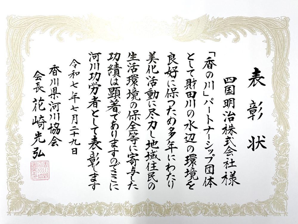 7月29日(火)、四国明治株式会社は、香川県河川協会から「河川功労者」として表彰されました。 この表彰は、香の川パートナーシップ団体の一員として、財田川の水辺環境保全活動に長年取り組んできたことが評価されたものです。 具体的には、香川工場の従業員やそのご家族を中心に、河川のゴミ拾いなどの活動を積極的に行い、水辺の美化と環境保全に努めてきました。 今後も引き続き、地域の水辺の環境整備と保全に取り組んでまいります。